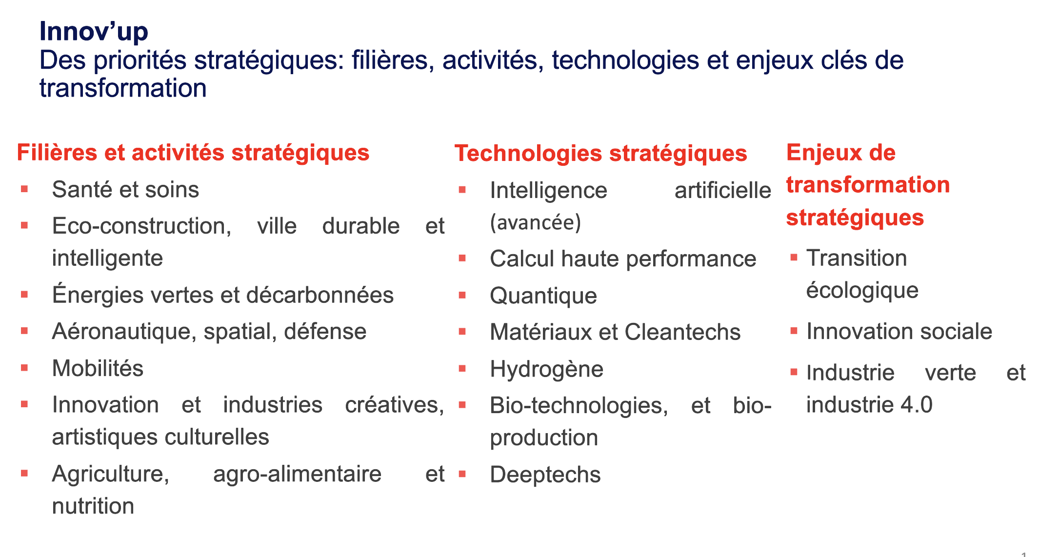 - Retombées sociétales & environnementales ⇒ Alignement avec les filières stratégiques :